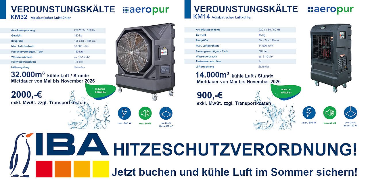 Der KM14 ist ein adiabatischer Luftkühler und überzeugt mit einem Luftdurchsatz von 14.000 m³ pro Stunde. Je trockener und wärmer die angesaugte Luft ist, desto stärker wird die Temperatur der zugeführten Luft gesenkt.