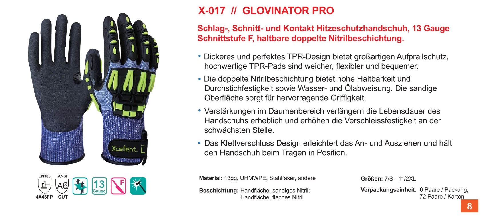XCellent® GLOVINATOR PRO Schlag- und Schnitt-Schutzhandschuh, Level F, X-017